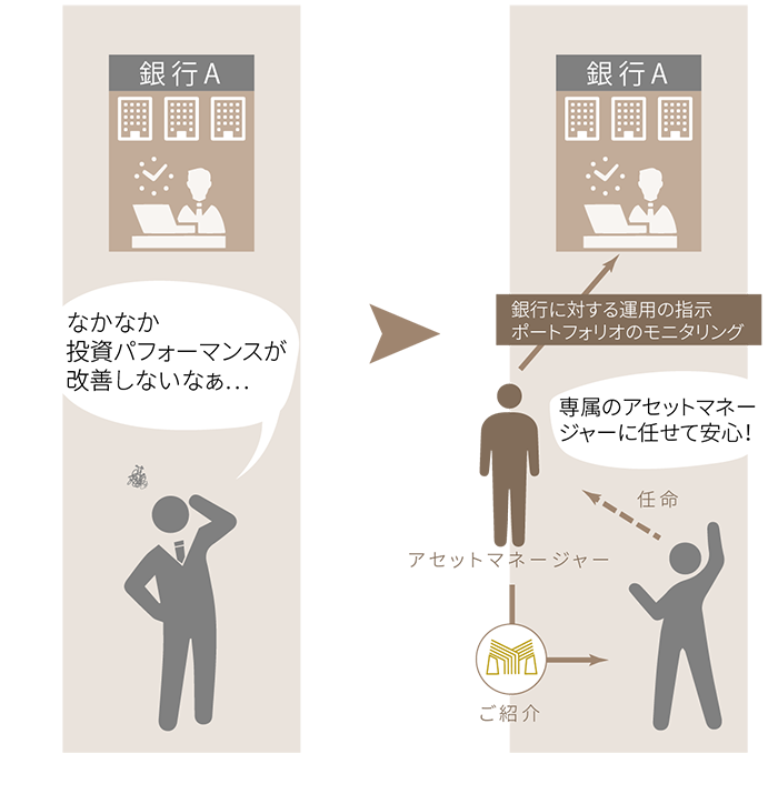 既存の銀行口座をそのまま保有し、外部のアセットマネージャーに運用を任せることで、 金融商品の調達コストを下げ、お客様のリスク嗜好に合致した最適な投資ポートフォリオ を構築することが可能です。